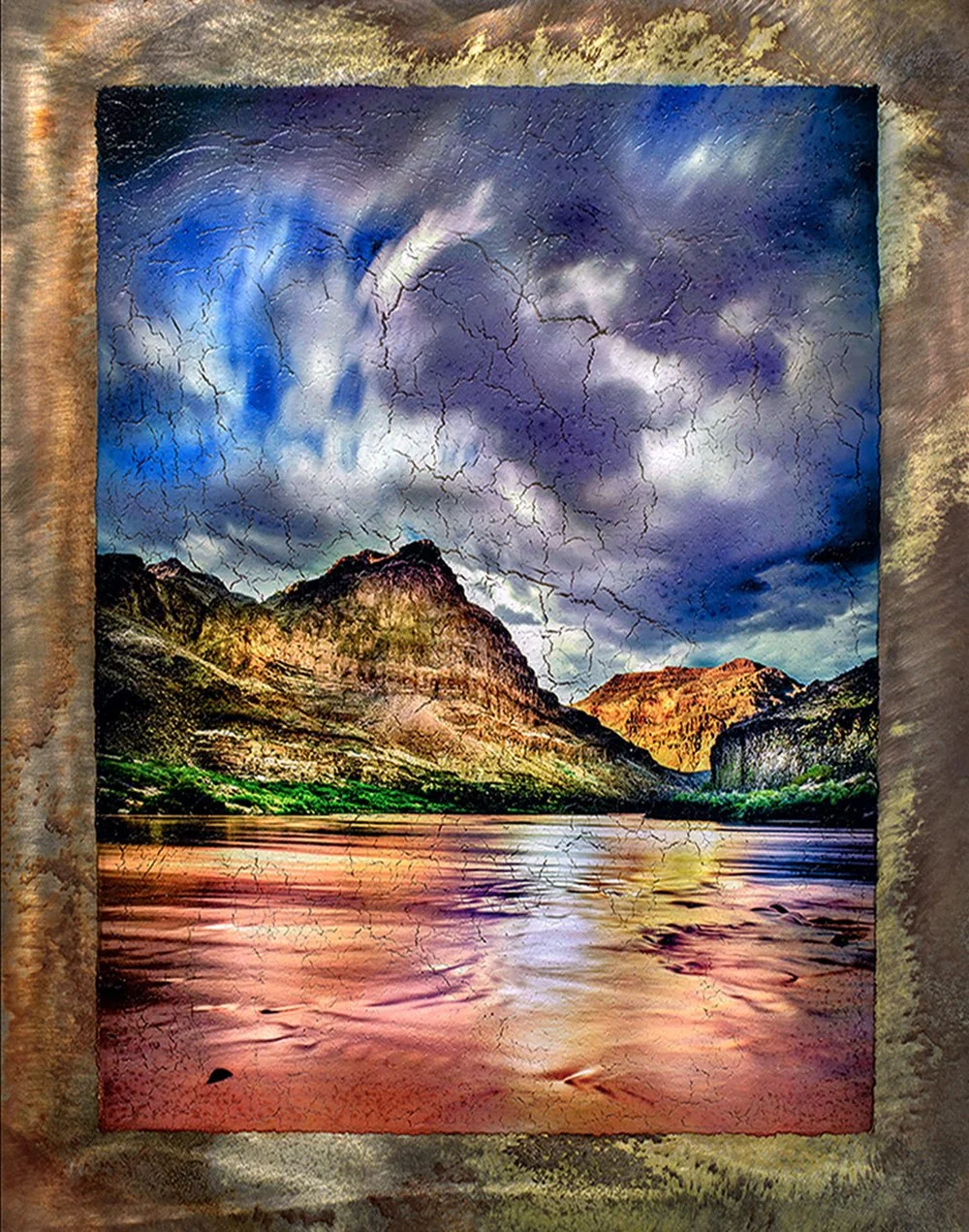 Approaching Stormclouds Near Whitmore Wash, Mile 192, Grand Canyon, AZ (mixed-media pigment direct printed on distressed paint surface on copper panel, 36” x24”)
